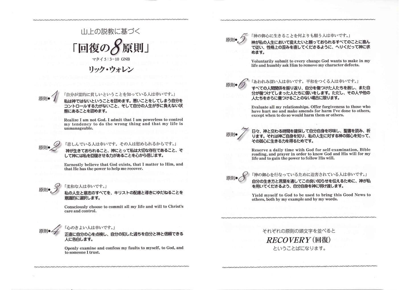 『リカバリー -回復の喜び』は、カリフォルニア州にあるサドルバック教会のジョン・ベイカー牧師、リック・ウォレン牧師が聖書に基づき、健全で適切にそうした傷と向き合い、回復への道を見いだしていくために考案したプログラムです。